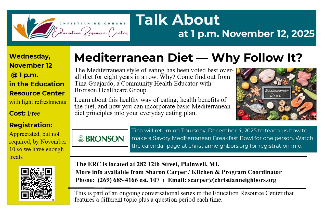 The Mediterranean Diet -- Why Follow it? Come learn from Tina Guajardo, a Community Health Educator with Bronson Healthcare Group, why the Mediterranean style of eating has been voted the best overall diet for eight years in a row. We'll learn about this healthy way of eating, health benefits of the diet, and how you can incorporate basic Mediterranean diet principles into your everyday eating plan. Contact Sharon at (269) 685-4166 ext. 107 or scarper@christianneighbors to register.